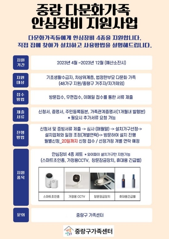한국다문화뉴스 = 소해련 기자 | 서울 중랑구가 취약계층 다문화가족을 대상으로 스마트 초인종 등 안심장비를 지원한다고 12일 밝혔다.