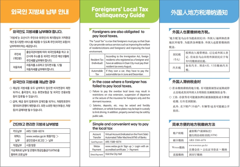 이번 외국인 지방세 납부안내 리플릿은 주민세(개인분) 및 자동차세 등 소액 체납자가 많이 발생함에 따라 지방세 체납에 따르는 압류 등 불이익과 간단하고 편리하게 납부할 수 있는 방법 등에 대한 정보를 담았다.
