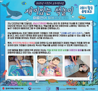 이번 활동을 통해 다문화가정 부모와 자녀는 책을 매개로 이중언어 활용과 환경 보호 학습을 동시에 경험하며 즐겁고 의미 있는 시간을 보냈다. 관련 문의는 성남시가족센터 가족정착팀(031 757-9327, 내선 5번)으로 하면 된다.