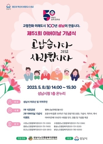 한국다문화뉴스 = 소해련 기자 | 성남시는 시 승격 50주년을 기념해 오는 8일 '고령 친화 미래도시 100년 성남이 만듭니다'를 슬로건으로 한 어버이날 행사를 연다.