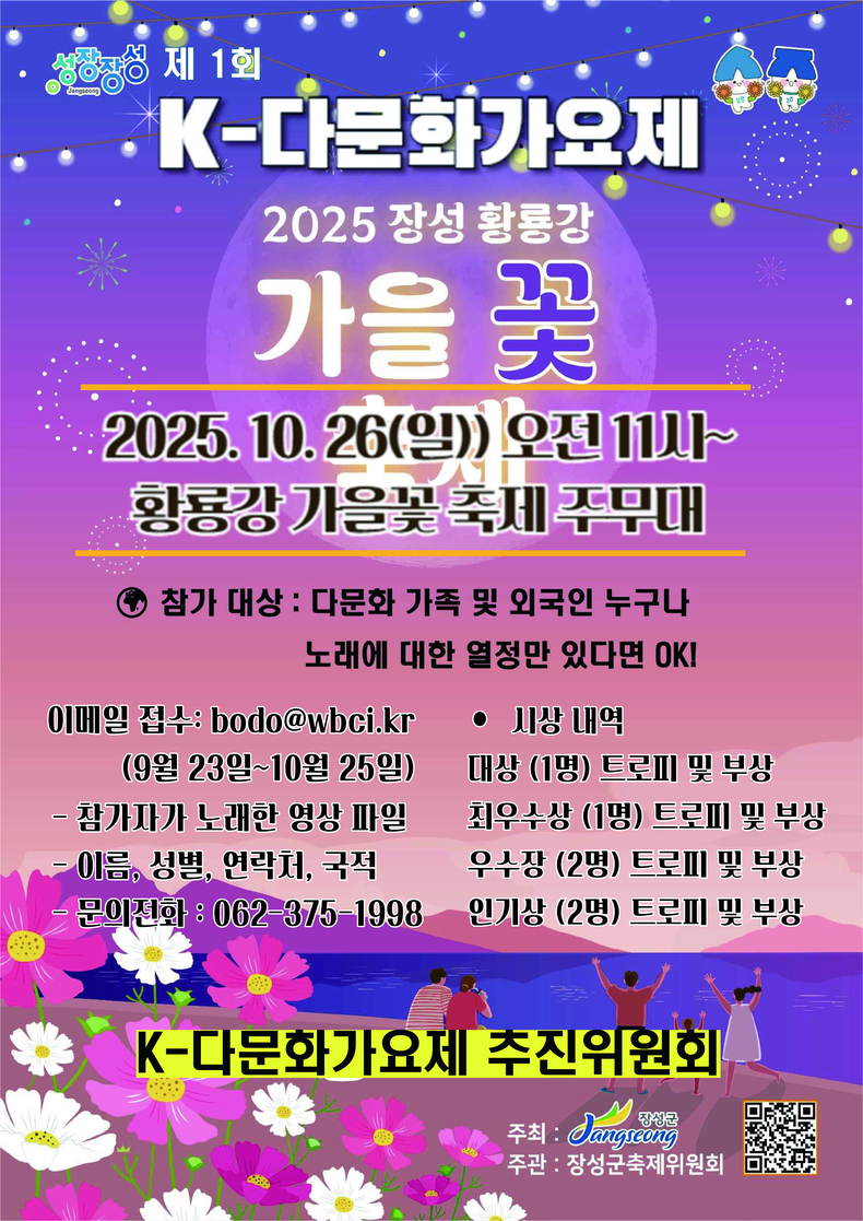 장성군은 오는 10월 26일 오전 11시, 황룡강 가을꽃 축제 주무대에서 ‘제1회 K-다문화가요제’를 개최한다. 이번 행사는 다문화 가족과 외국인 주민이 함께 어우러져 가을의 정취 속에서 노래로 소통하고 화합하는 축제의 장을 마련하고자 기획됐다.