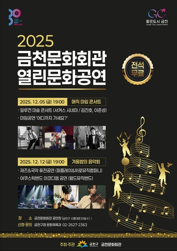 금천구는 오는 12월 5일과 12월 12일 오후 7시, 두 차례에 걸쳐 금천문화회관에서 기획공연 '2025 금천문화회관 열린문화공연'을 개최한다고 밝혔다.