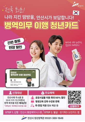 안산시는 내년 1월부터 병역의무를 성실히 이행한 청년을 예우, 지원하기 위해 전국 최초로 '병역의무 이행 청년카드(이하 청년카드)'를 온라인으로 발급한다고 22일 밝혔다.