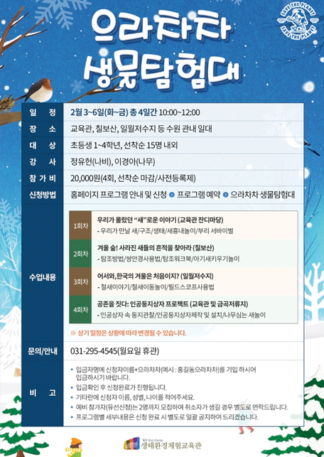 ‘으라차차 생물탐험대’는 칠보산과 일월저수지, 교육관 인근 공원에서 숲과 습지를 탐색하며 겨울철 새들을 관찰하는 참여자 주도형 생태탐사 프로그램이다. 2월 3일부터 6일까지 총 4회에 걸쳐 진행된다. 참가비는 2만 원이다.