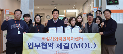 이번 협약식에는 양 기관 관계자들이 참석한 가운데 협약서 서명과 기념촬영이 진행되었으며, 협약에 앞서 화성시외국인복지센터의 주요 사업과 역할을 소개하는 홍보 영상이 상영되어 상호 이해를 높이는 시간을 가졌다.