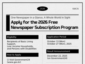 The 2026 Free Newspaper Subscription Program will be open from October 13 to 27. This initiative, organized by the Ministry of Culture, Sports and Tourism and the Korea Press Foundation, aims to promote reading culture across the nation by providing free newspaper or magazine subscriptions for one year to citizens who face financial challenges in subscribing to print media. The program targets recipients of basic living subsidies, low-income households, and persons with disabilities. Each household can receive one newspaper or magazine for a year, with the full subscription fee covered by the