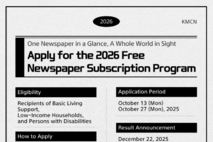 The 2026 Free Newspaper Subscription Program will be open from October 13 to 27. This initiative, organized by the Ministry of Culture, Sports and Tourism and the Korea Press Foundation, aims to promote reading culture across the nation by providing free newspaper or magazine subscriptions for one year to citizens who face financial challenges in subscribing to print media. The program targets recipients of basic living subsidies, low-income households, and persons with disabilities. Each household can receive one newspaper or magazine for a year, with the full subscription fee covered by the
