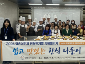 양주시가족센터는 결혼이민자의 안정적인 한국 정착을 돕기 위해 ‘결혼이민자 정착단계별 지원패키지 – 쉽고 맛있는 한식요리교육’을 2025년 11월 5일부터 11월 19일까지 매주 수요일 10시~12시, 총 3회기에 걸쳐 경동대학교 호텔조리학과 실습장에서 운영하였다. 본 프로그램은 결혼이민자들의 건강한 국내 생활 적응을 도모하고, 지역사회 구성원으로 폭넓게 경험할 수 있도록 기획되었다. 참여자들은 ▲명절 차림(잡채·전류) ▲생일 차림(미역국·닭조림) ▲간식 차림(김밥·떡볶이) 등 한국의 대표 가정요리를 직접 조리하며 한식문화에 대한 이해를 높였다. 특히 이번 교육은 경동대학교 호텔조리학과(이재상 교수) 학생들의 1:1 실습지도와 적극적인 소통으로 참여자 만족도가 매우 높았으며, 처음 한국 요리를 접하는 결혼이민자들에게 한식문화에 자연스럽게 다가갈 수 있는 시간이 되었다. 참여자인 응웬***(베트남, 20대)은 ‘한국 음식을 직접 만들어보니 더 맛있다. 집에서 남편에게 해주면 좋을 것 같다’, 너****(라오스, 20대)는 ‘잡채를 배워서 시어머니에게 해주고 싶다’고 참여 소감을 전했다. 이은순 센터장은 ‘준비와 실습을 도와준 경동대학교 호텔조리학과에 깊이 감사드