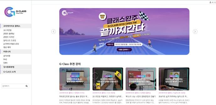 현재 ‘G-Class’에서는 ▲3D 프린팅, ▲콘텐츠 플래닝, ▲콘텐츠 디자인, ▲일러스트 드로잉, ▲손가락디지털드로잉, ▲영상제작 총 6개 강의를 운영하고 있다. 6개의 강의는 ‘G-Class’에서 회원 가입 후 모두 무료로 수강할 수 있다.