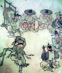 조선시대의 화가 김홍도의 그림 ‘무동’은 이러한 삼현육각의 악기 편성을 잘 보여주는 자료이다.그림의 왼쪽 위를 보면 벙거지를 쓰고 매달아 놓은 북을 치고 있는 사내가 있다. 좌고를 치는 중이다. 그 오른쪽의 갓을 쓴 사내는 장구를 치고 있고, 또 그 오른쪽의 사내 둘은 피리를 붙고 있다.