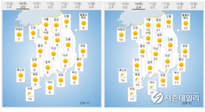 한국다문화뉴스=정영한 기자ㅣ 오늘(16일) 전국이 대체로 맑은 가운데, 내륙을 중심으로 낮과 밤의 기온차가 15도 내외로 매우 크겠으니, 건강관리에 각별히 유의하기 바랍니다.
