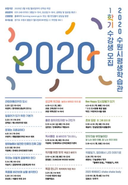 강좌별 일정과 모집인원 등 자세한 내용은 수원시평생학습관 홈페이지(https://learning.suwon.go.kr/) ‘공지사항’에 게시된 ‘2020년 1학기(3~6월) 수원시평생학습관 수강생 모집 안내’에서 확인하면 된다.