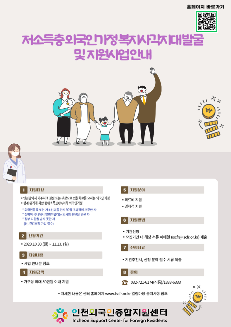 인천광역시 관내 저소득층 외국인 가정을 대상으로 하절기(6~9월) 3개월분 전기요금(공공요금)을 최대 20만원까지 지원사는 사업이며, 해당 사업을 통하여 복지사각지대를 해소하고 생계곤란 등위기상황에 처하여 긴급복지 해택을 받지 못한 저소득측 외국인(기준 중위소득 80%이하)가정을 대상으로 선정했다.