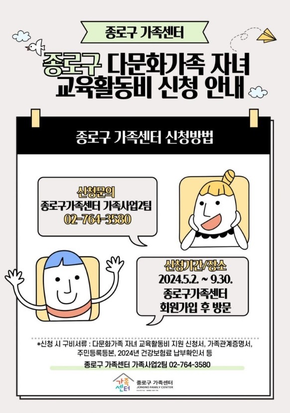한국다문화뉴스 = 소해련 기자 | 서울 종로구는 오는 9월 30일까지 '다문화가족 초중고 자녀 교육활동비' 신청을 접수한다고 5일 밝혔다.