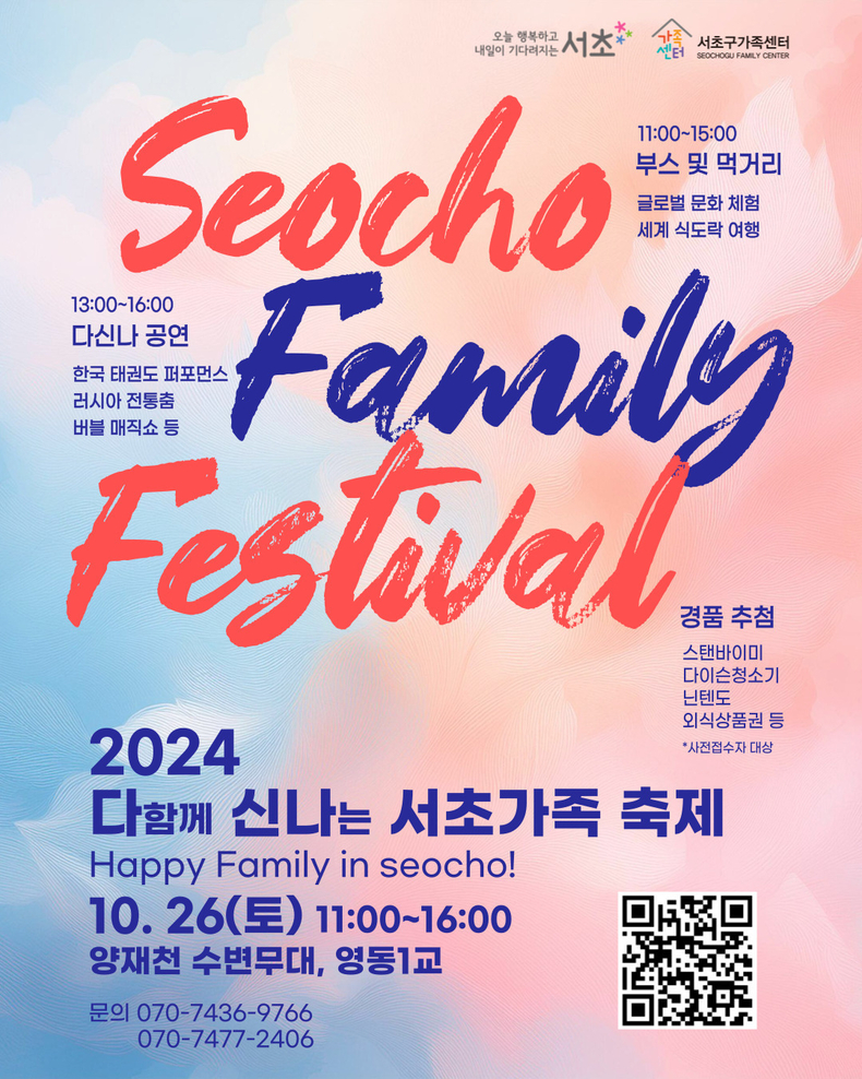 한국다문화뉴스 = 강성혁 기자 | 서초구 가족센터가 서초구 온 가족들과 함께 신나게 즐길 수 있는 “2024 다함께 신나는 서초” 가족 축제를 오는 10월 26일(토)에 개최한다.