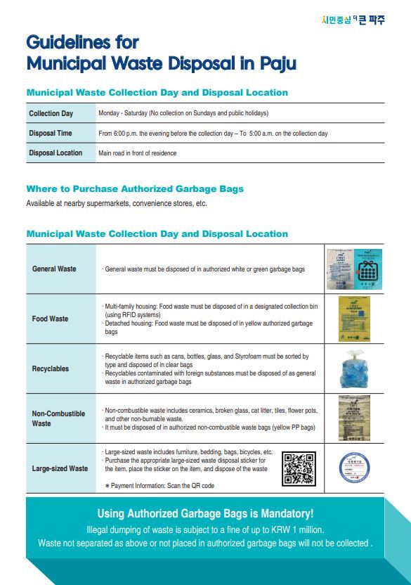 생활폐기물 안내문에는 쓰레기 배출 수거 시간 및 장소, 종량제 봉투 구입처, 일반쓰레기·음식물쓰레기·재활용품·대형폐기물 종류별 배출 방법, 쓰레기 무단투기 과태료 등에 대한 내용이 담겨있으며, 실제 파주시 종량제 봉투 사진을 삽입해 외국인이 이해하기 쉽게 제작됐다.