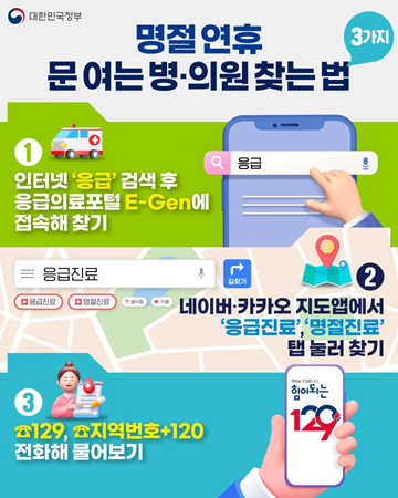 설 연휴에 갑자기 아프면 응급의료포털(e-gen, www.e-gen.or.kr)이나 보건복지부 콜센터 129, 시도 콜센터 120 전화를 통해 가까운 곳의 문 연 병의원과 약국을 쉽게 찾을 수 있다.