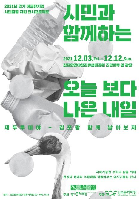 (재)김포문화재단은 12월3일부터 12월12일까지 김포한강야생조류생태공원 조망마루 앞 광장에서 업사이클링 야외전시를 개최한다. 본 야외전시는 (재)경기문화재단이 주최하는 2021 경기에코뮤지엄 김포권역 협력사업 일환으로 진행된다.