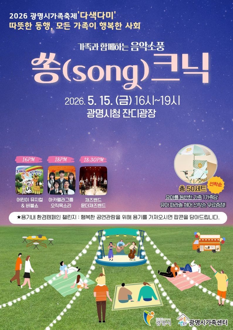 광명시가족센터(센터장 남은정)는 5월 15일 오후 4시부터 7시까지 광명시청 앞 잔디광장에서 ‘2026년 광명시 가족축제 <가족과 함께하는 음악소풍 쏭(Song)크닉>’을 개최한다고 밝혔다.