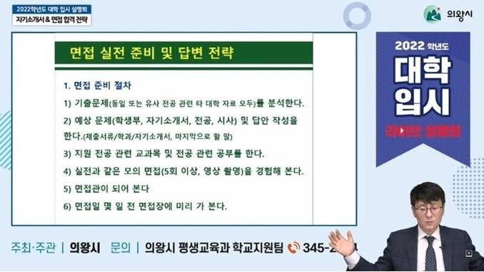 이번 설명회는 △메가스터디 남윤곤 입시전략연구소장의 수시분석 및 지원전략 강의와 △데오럭스 교육그룹 장광원 대표의 자기소개서 및 면접 합격 전략 강의로 나누어 의왕시 유튜브 채널을 통해 실시간으로 진행됐다.