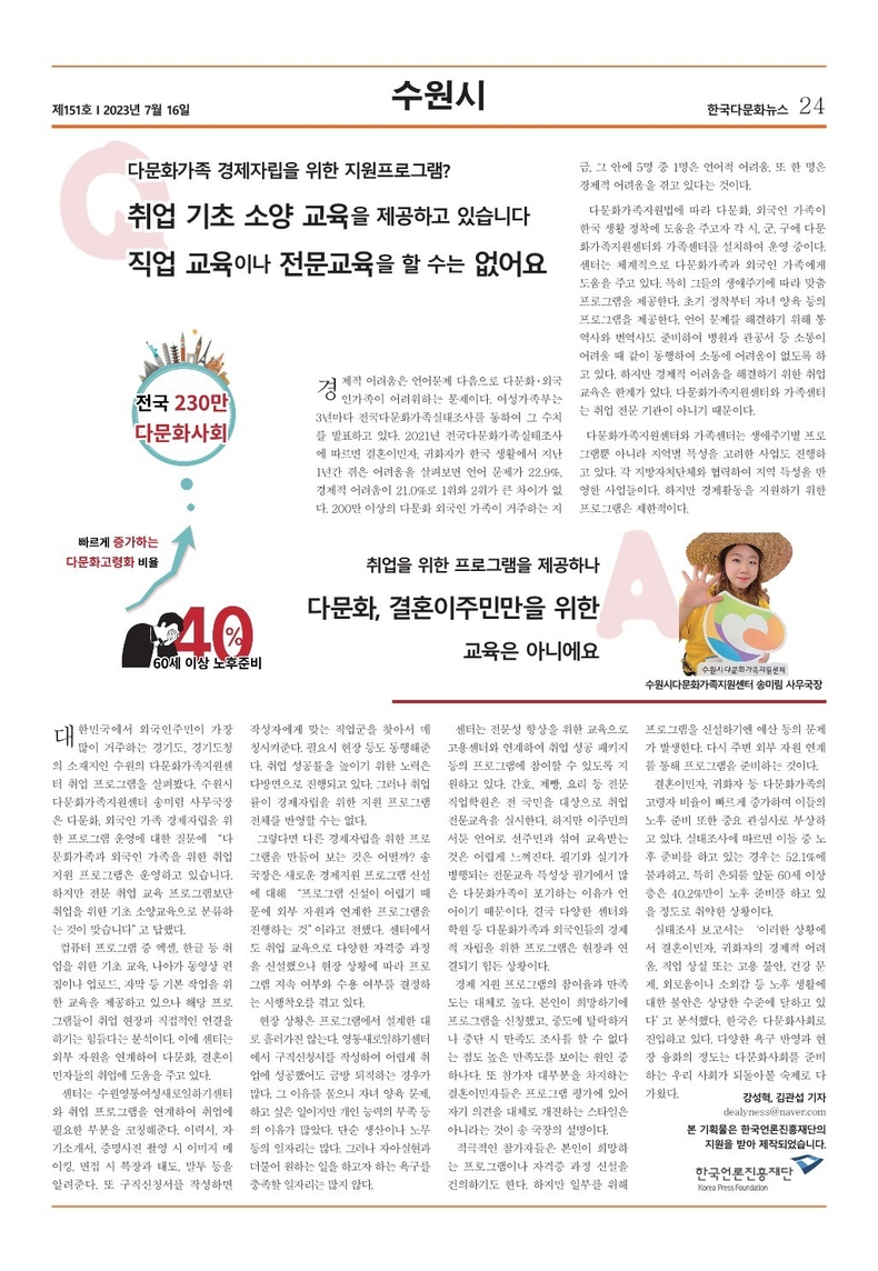 대한민국에서 외국인주민이 가장 많이 거주하는 경기도, 경기도청의 소재지인 수원의 다문화가족지원센터 취업 프로그램을 살펴봤다. 수원시다문화가족지원센터 송미림 사무국장은 다문화, 외국인 가족 경제자립을 위한 프로그램 운영에 대한 질문에 “다문화가족과 외국인 가족을 위한 취업 지원 프로그램은 운영하고 있습니다. 하지만 전문 취업 교육 프로그램보단 취업을 위한 기초 소양교육으로 분류하는 것이 맞습니다”고 답했다.