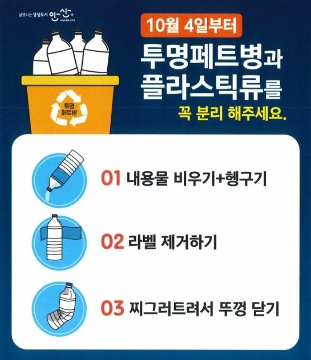 정부는 작년 8월 ‘재활용가능자원의 분리수거 등에 관한 지침’ 개정을 통해 투명페트병 별도 분리배출 제도를 시행했다. 작년 12월부터 공동주택은 먼저 분리배출이 시행됐으며, 오는 12월25일부터는 단독주택도 적용되고, 안산시는 경기도 시범사업 시-군으로 선정돼 이달부터 우선적으로 시범 실시된다.
