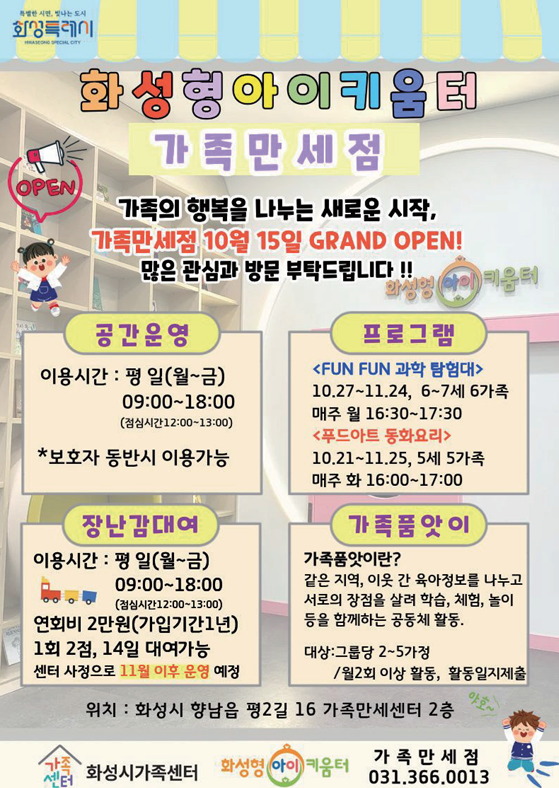 관련 문의는 화성시가족센터 화성형아이키움터 가족만세점(☎031 366-0013)으로 하면 된다.