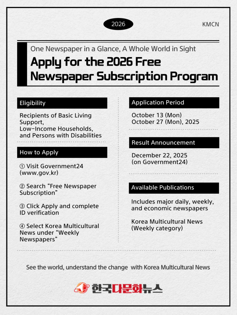 Applicants who choose Korea Multicultural News can receive the publication free of charge throughout 2026.
