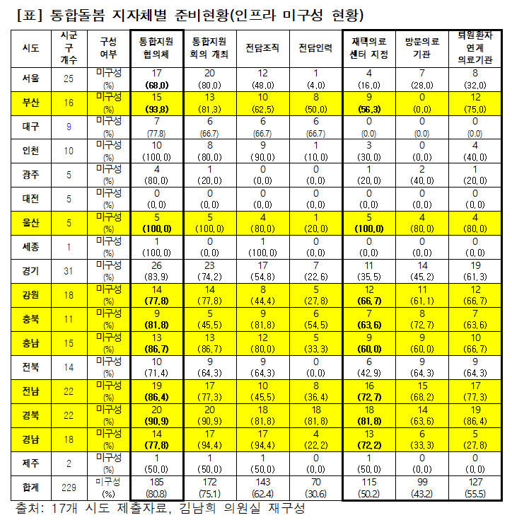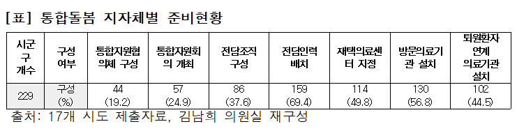 국회 보건복지위원회 소속 김남희 더불어민주당 의원실이 전국 229개 지자체의 통합돌봄 서비스 준비 상황을 전수 점검한 결과, 전반적인 준비 수준이 낮은 것으로 확인됐다.