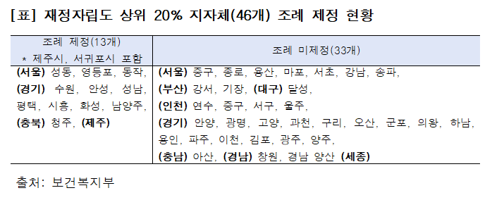 국비 지원 체계도 문제로 지적됐다. 정부는 내년도 통합돌봄 예산을 재정자립도 하위 80% 지자체(183곳)에만 지원할 계획이다. 이에 따라 상위 20% 지자체(46곳)는 국비 지원 대상에서 제외된다. 이 가운데 33곳은 통합돌봄 관련 조례조차 제정하지 않았고, 전담조직도 설치되지 않은 곳이 많아 사업 추진에 차질이 우려된다.