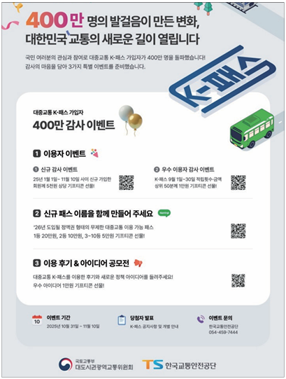 또한, 이용자 아이디어 공유 행사도 함께 열어 K-패스를 이용하면서 좋았던 점이나 개선이 필요하다고 느낀점을 제안 받아 우수 제안자에게는 소정의 상품을 제공한다.