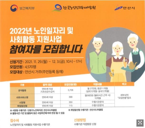 안산시(시장 윤화섭)는 ‘2022년 노인일자리 및 사회활동 지원사업’ 참여자 4천570명을 다음달 3일 오후 5시까지 모집한다고 29일 밝혔다.