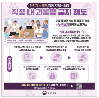 고용노동부는 직장 내 괴롭힘 금지 제도에 대한 안내를 다시 강조하며, 피해 예방과 보호를 위한 법적 조치가 강화되고 있다고 밝혔다.