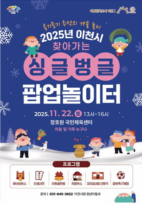 이천시(시장 김경희)는 아동친화도시 놀이문화 확산과 아동의 놀권리 보장을 위해 『찾아가는 싱글벙글 팝업 놀이터‘겨울놀이’』행사를 오는 11월 22일(토) 장호원 국민체육센터에서 개최한다고 밝혔다.