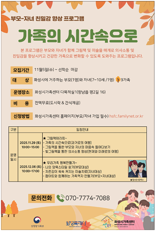 부모자녀 친밀감 향상 프로그램 관련 문의사항은 화성시 가족센터 상담사례팀 전화 (070-7774-7088)로 연락하면 된다.