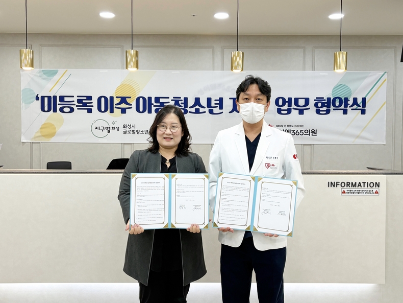 화성이엠365의원(대표 원장 신형진)이 2025년10월24일(금) 원내에서 화성시글로벌청소년센터(센터장 강은이)와 함께 '미등록 이주 아동청소년 지원을 위한 업무협약'을 체결했다고 전했다.
