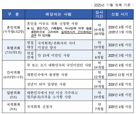 이 유형의 심사기간은 약 19개월, 기준 신청 시기는 2024년 4월 이전으로 안내됐다. 국적회복(국적법 제9조)의 경우 심사기간은 7개월이며, 기준 신청 시기는 2025 년 1월 이전이다.
