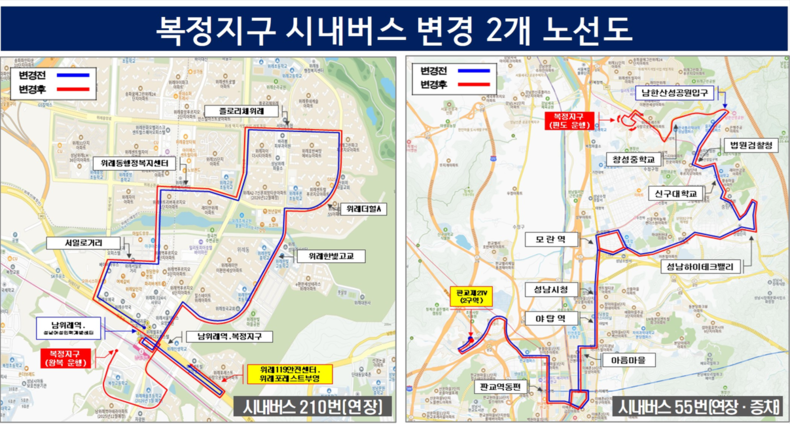 신설 노선 외에도 기존 55번과 210번 등 두 개 노선이 변경된다. 55번은 종점이었던 남한산성공원입구에서 복정지구까지 연장되고 증차되며, 이를 통해 복정지구 중학생들이 창성중학교로 이동할 수 있는 통학 수단이 마련된다. 또한 배차간격 단축으로 성남 본시가지·판교역·판교제1·2테크노밸리 간 이동 편의도 높아진다.