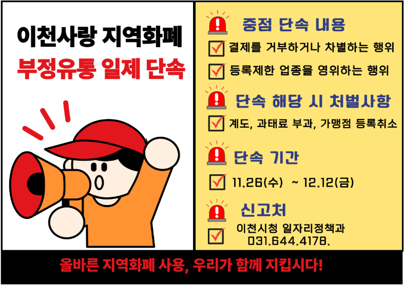 이천시는 경기이천사랑지역상품권의 올바른 사용 환경을 조성하고 건전한 유통 질서를 확립하기 위해 11월 26일부터 12월 12일까지 지역사랑상품권 부정유통 근절을 위한 일제 단속을 추진한다고 밝혔다.