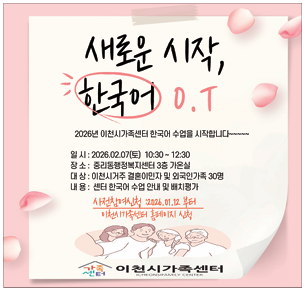 센터는 이를 통해 학습자의 한국어 능력에 맞춘 수업 운영을 준비한다는 계획이다. 신청은 2026년 1월 12일부터 가능하며, 이천시가족센터 공식 홈페이지를 통해 접수할 수 있다.