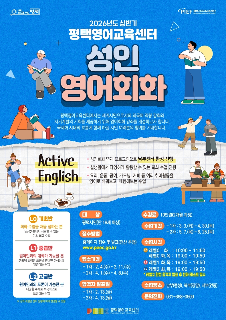 2026년 상반기 성인 영어 회화 프로그램 1기는 남부(팽성), 북부(장당), 서부(안중) 센터에서 각각 운영되며, 수강 신청은 2월 4일부터 11일까지 진행된다. 수업은 3월부터 2개월 과정으로 운영될 예정이다.