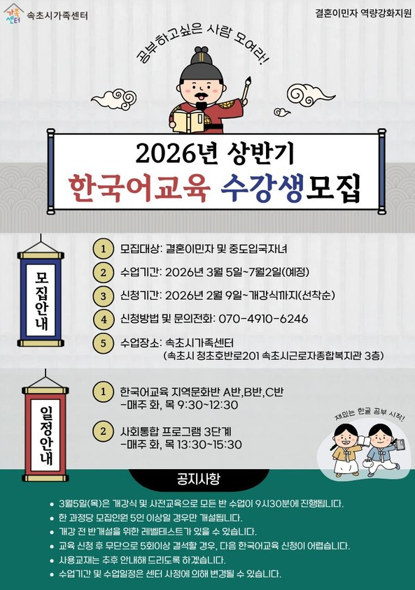 강원 속초시(시장 이병선) 속초시가족센터가 결혼이민자의 지역사회 정착을 돕기 위해 한국어 교육과 운전면허 취득 지원사업 참여자를 모집한다.