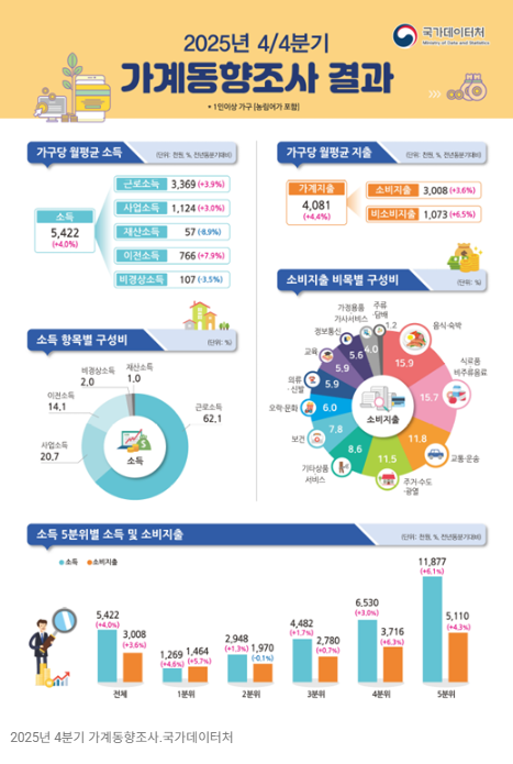 저소득층과 고소득층 모두 소득은 증가했다. 다만 상위 20% 가구의 소비는 오히려 줄어, 소득 증가가 곧바로 소비 확대로 이어지지는 않는 모습도 나타났다.
