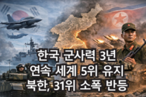 2026년 미국 군사력 평가기관 글로벌파이어파워(Global Firepower, GFP)가 발표한 ‘2026 군사력 랭킹(2026 Military Strength Ranking)’에서 대한민국은 재래식 전력 기준 전 세계 145개국 가운데 5위를 기록하며 3년 연속 상위권을 유지했다. 한국의 군사력 평가지수(PwrIndx) 0.1642는 낮을수록 재래식 전력이 강하다는 의미로, 미국·러시아·중국·인도에 이어 다섯 번째로 평가됐다. GFP는 병력 규모, 무기체계, 국방예산, 군수지원 능력, 예비군 규모 등 60여 개 항목을 종합해 평가하며 핵무기 및 비대칭 전력은 평가 대상에서 제외한다. 같은 평가에서 북한(조선민주주의인민공화국)은 PwrIndx 0.5933으로 31위를 기록하며 지난해보다 세 계단 상승한 순위를 보였다. 북한은 과거 2019년에 18위까지 올랐지만 이후 하락세를 거쳐 최근 2년간 반등하는 흐름이 이어지고 있다. 병력과 일부 장비 수량 측면에서는 일정한 규모를 유지하고 있으나 질적 측면의 재래식 전력 구성이 한국과 비교해 여전히 차이가 있는 것으로 나타났다. 이번 GFP 순위의 상위권은 전통적으로 미국이 1위, 러시아가 2위, 중국이 3위, 인