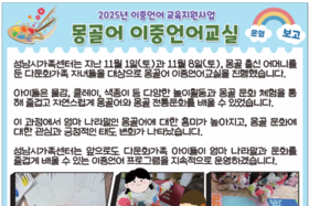 성남시가족센터(센터장 송문영)는 몽골 출신 모(부)를 둔 만 3세부터 만 9세까지의 다문화가족 자녀를 대상으로 이중언어 교육지원사업의 일환인 ‘몽골어 이중언어교실’을 운영했다. 이번 프로그램은 2025년 11월 1일과 11월 8일 두 차례에 걸쳐 센터 B108호 강의실에서 진행됐다. 몽골어 이중언어교실은 다문화가족 자녀가 부모의 출신 국가 언어와 문화를 자연스럽게 접할 수 있도록 마련된 교육 프로그램으로, 교육과 문화 체험을 병행하는 방식으로 구성됐다. 참여 아동들은 물감, 클레이, 색종이 등 다양한 놀이활동과 함께 몽골 문화 체험에 참여하며 몽골어와 몽골 전통문화를 익혔다. 프로그램에 참여한 아이들은 놀이 중심 활동을 통해 몽골어에 대한 흥미를 높였으며, 몽골 문화에 대한 관심과 긍정적인 태도 변화도 나타났다. 특히 엄마 나라 말인 몽골어를 즐겁게 배우는 과정 속에서 언어와 문화에 대한 친밀감을 자연스럽게 형성하는 계기가 됐다. 성남시가족센터는 앞으로도 다문화가족 자녀들이 부모의 모국어와 문화를 즐겁게 배울 수 있도록 이중언어 교육지원 프로그램을 지속적으로 운영할 계획이다. 관련 문의는 성남시가족센터 가족정착팀(031-757-9327, 내선 5번)으로 하면